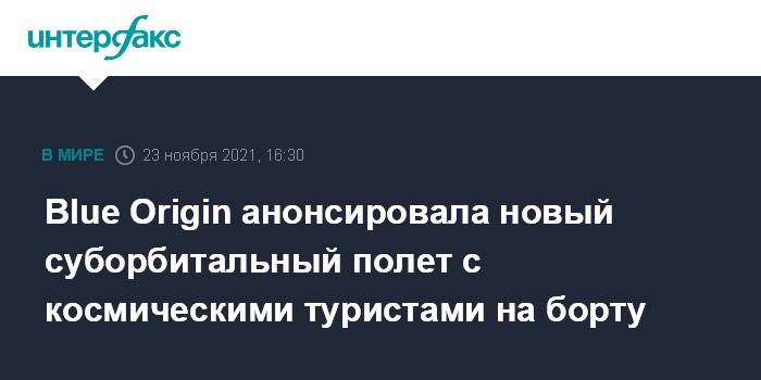 Москва. 23 ноября. INTERFAX.RU - Американская частная аэрокосмическая компания Blue Origin отправит в суборбитальный полет на ракете New Shepard шестерых космических туристов, запуск запланирован на 9 декабря, сообщила компания во вторник.