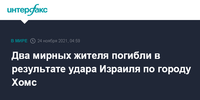Москва. 24 ноября. INTERFAX.RU - Два мирных жителя были убиты, еще один гражданский и шестеро военных ранены в результате удара Израиля по городу Хомсу, сообщает сирийское государственное агентство САНА.