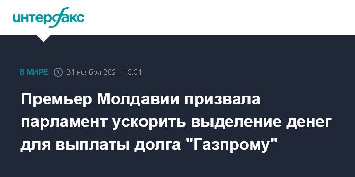 Москва. 24 ноября. INTERFAX.RU - Премьер-министр Молдавии Наталья Гаврилица обратилась в парламент с просьбой ускорить процедуры по выделению денег "Молдовагазу" для погашения текущей задолженности перед "Газпромом".