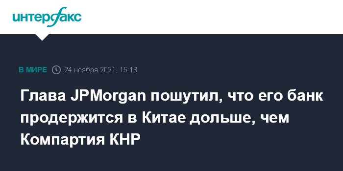 Москва. 24 ноября. INTERFAX.RU - Главный исполнительный директор JPMorgan Chase & Co Джейми Даймон пошутил, что возглавляемый им банк, вероятно, продержится в Китае дольше, чем Коммунистическая партия КНР.