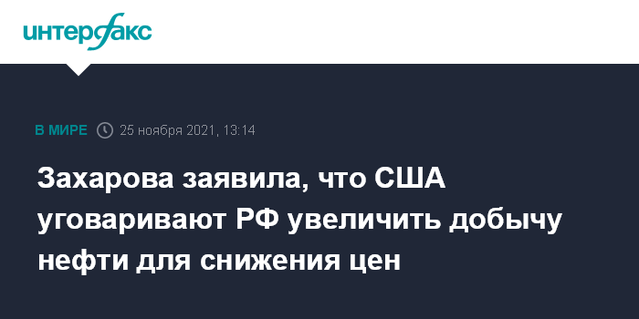 Москва. 25 ноября. INTERFAX.RU - США уговаривают Россию увеличить добычу углеводородов для снижения цен, сообщила официальный представитель МИД РФ Мария Захарова.