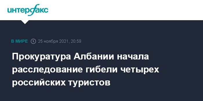 Москва. 25 ноября. INTERFAX.RU - Прокуратура Албании в четверг сообщила, что начала расследование гибели четырех российских туристов на местном курорте в октябре, сообщает агентство Associated Press.
