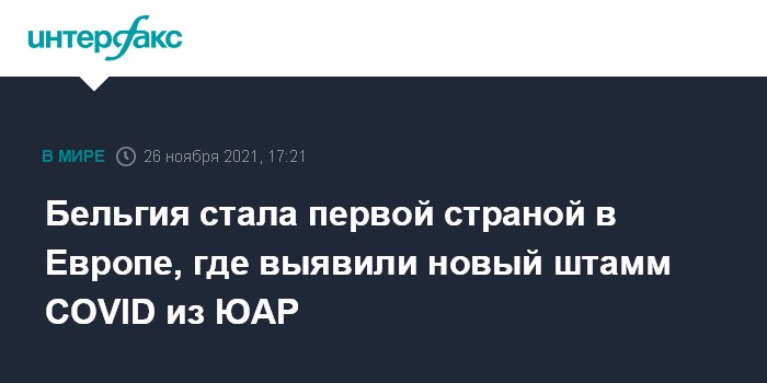 Москва. 26 ноября. INTERFAX.RU - В Бельгии выявили первый случай заражения новым штаммом коронавируса, который обнаружили в ЮАР, сообщили франкоязычные СМИ. Это первый случай обнаружения варианта B.1.1.529, зафиксированный медиками в европейских странах.