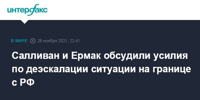 Москва. 26 ноября. INTERFAX.RU - Советник президента США по нацбезопасности Джейк Салливан в пятницу обсудил по телефону с главой администрации президента Украины Андреем Ермаком усилия по деэскалации ситуации на российско-украинской границе, сообщили в Белом доме.