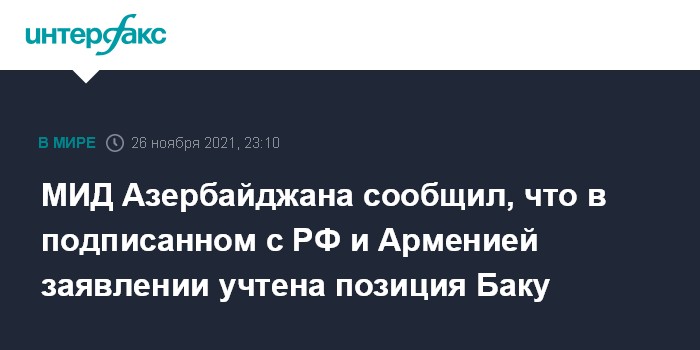 Москва. 26 ноября. INTERFAX.RU - Заявление лидеров Азербайджана, РФ и Армении, подписанное по итогам трехсторонних переговоров 26 ноября в Сочи полностью учитывает официальную позицию Баку, говорится в заявлении МИД Азербайджана.