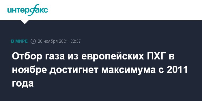 Москва. 28 ноября. INTERFAX.RU - Отбор газа из подземных хранилищ в Европе в ноябре 2021 года достигнет максимального уровня за историю наблюдений ассоциации Gas Infrastructure Europe (c 2011 года).