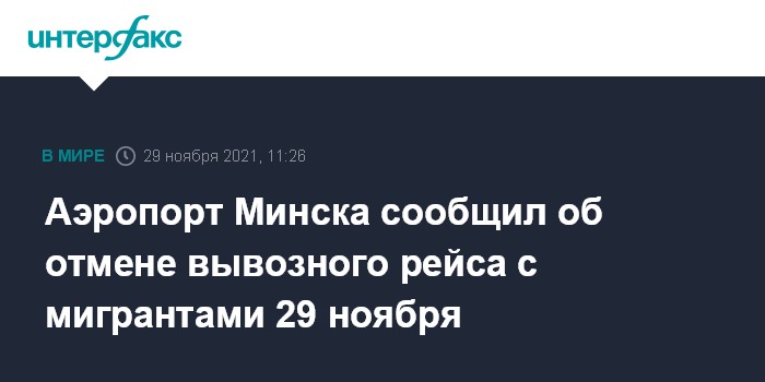 Москва. 29 ноября. INTERFAX.RU - Национальный аэропорт Минска сообщил, что отменен вывозной рейс авиакомпании Iraqi Airways в Эрбиль. Предполагалось, что этим рейсом Белоруссию покинет очередная группа мигрантов из Ирака.