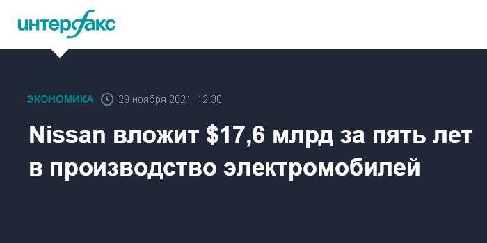 Москва. 29 ноября. INTERFAX.RU - Японский автопроизводитель Nissan Motor Co. планирует потратить $71,6 млрд в ближайшие пять лет на расширение линейки электромобилей, пишет The Wall Street Journal.