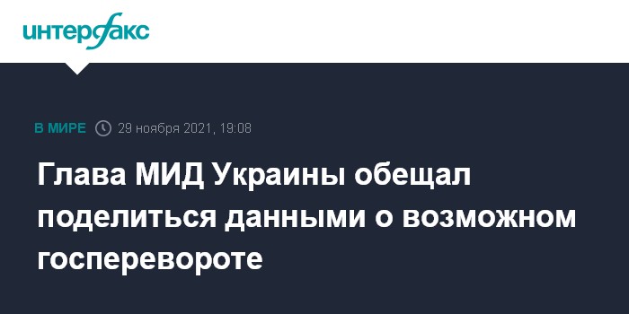 Москва. 29 ноября. INTERFAX.RU - Украина очень серьезно смотрит на доступную правительству информацию о потенциальном государственном перевороте и поделится ею с партнерами, сообщил министр иностранных дел Украины Дмитрий Кулеба.