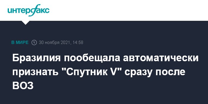 Москва. 30 ноября. INTERFAX.RU - Бразилия автоматически признает российскую вакцину "Спутник V" после того, как ее признает Всемирная организация здравоохранения (ВОЗ), заявил глава МИД Бразилии Карлус Альберту Франку Франса.