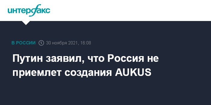 Москва. 30 ноября. INTERFAX.RU - Россия не приемлет создания трехстороннего оборонного альянса AUKUS Австралией, Великобританией и США, заявил президент РФ Владимир Путин.