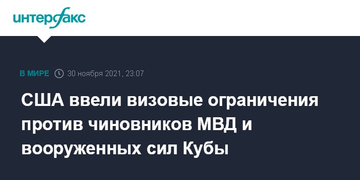 Москва. 30 ноября. INTERFAX.RU - Госдепартамент США во вторник объявил о расширении ограничительных мер, которые коснутся еще девятерых высокопоставленных сотрудников МВД Кубы и служащих вооруженных сил страны.