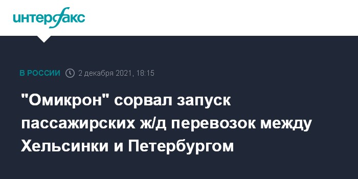 Москва. 2 декабря. INTERFAX.RU - Из-за появления штамма коронавируса "омикрон" возобновление пассажирского железнодорожного сообщения между Петербургом и Хельсинки откладывается, заявили в МИД Финляндии. Предполагалось, что оно возобновится 12 декабря.