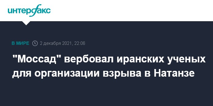 Москва. 2 декабря. INTERFAX.RU - Израильская разведка "Моссад" стояла за организацией в апреле диверсии на ядерном объекте в Натанзе, задействовав в операции группу завербованных иранских ученых, сообщает в четверг издающаяся в Лондоне газета Jewish Chronicle (JC).