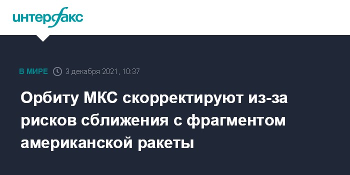 Москва. 3 декабря. INTERFAX.RU - В пятницу, 3 декабря, орбита МКС будет скорректирована для предотвращения опасного сближения с фрагментом ракеты "Пегас" США, сообщил глава "Роскосмоса" Дмитрий Рогозин.