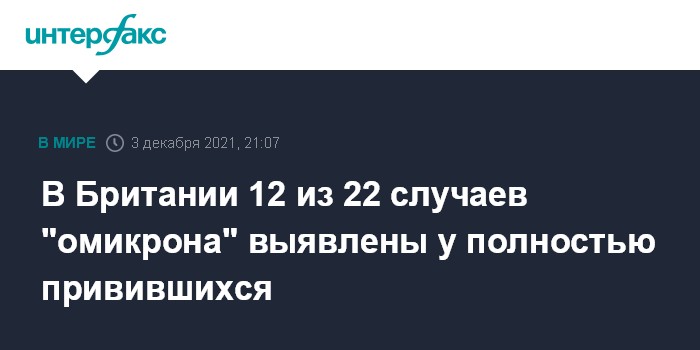 Москва. 3 декабря. INTERFAX.RU - В Великобритании из 22 выявленных к 30 ноября случаев заражения штаммов коронавируса "омикрон" 12 пришлось на тех, кто получил обе дозы вакцины от COVID-19, передает Sky News со ссылкой на брифинг Агентства безопасности здравоохранения Соединенного Королевства (UKHSA).