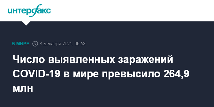 Москва. 4 декабря. INTERFAX.RU - Число зарегистрированных случаев заражения коронавирусом COVID-19 в мире на утро субботы выросло до 264 млн 950 626, свидетельствуют данные американского университета Джонса Хопкинса.