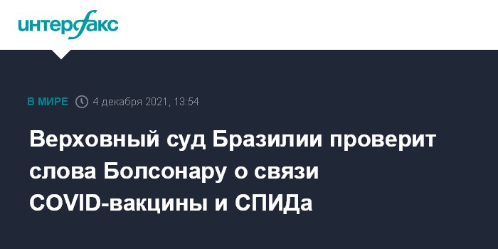 Москва. 4 декабря. INTERFAX.RU - Верховный суд Бразилии инициировал проверку после скандальных и неподтвержденных заявлений президента страны Жаира Болсонару о том, что вакцины от коронавируса якобы могут увеличить риск заражения СПИДом.