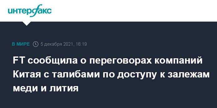 Москва. 5 декабря. INTERFAX.RU - Представители горнодобывающей отрасли КНР, желающей получить доступ к месторождениям меди и лития в Афганистан, совершили визит в страну для переговоров с движением "Талибан" (запрещено в РФ), сообщает газета Financial Times.