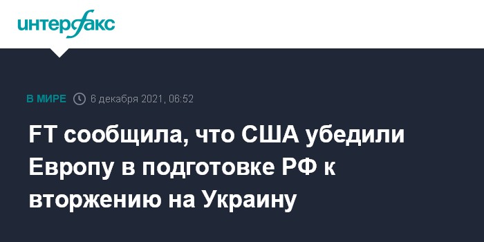 Москва. 6 декабря. INTERFAX.RU - Соединенным Штатам, благодаря активному воздействию на европейских союзников и путем предоставления им разведывательной информации, удалось убедить европейские страны в том, что Россия якобы готовит вторжение на Украину, сообщила газета Financial Times.