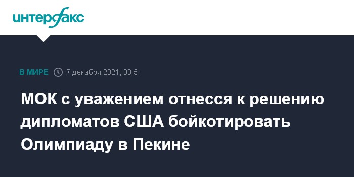 Официальные лица США не поедут на Олимпиаду в Пекин поддержать своих спортсменовЧитать подробнее"Присутствие правительственных чиновников и дипломатов - это чисто политическое решение каждого правительства, к которому МОК в своем политическом нейтралитете относится с полным уважением", - говорится в заявлении МОК.