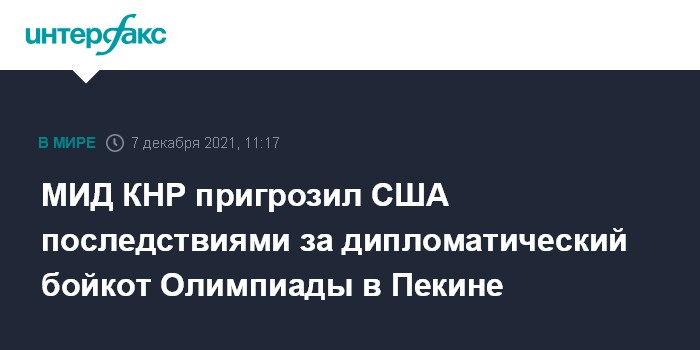 Официальные лица США не поедут на Олимпиаду в Пекин поддержать своих спортсменовЧитать подробнееОн отметил, что Пекин в связи с отказом США отправить официальных лиц на Олимпиаду в Пекин примет решительные контрмеры. В то же время он не уточнил, о каких мерах идет речь, и призвал следить за ходом событий.