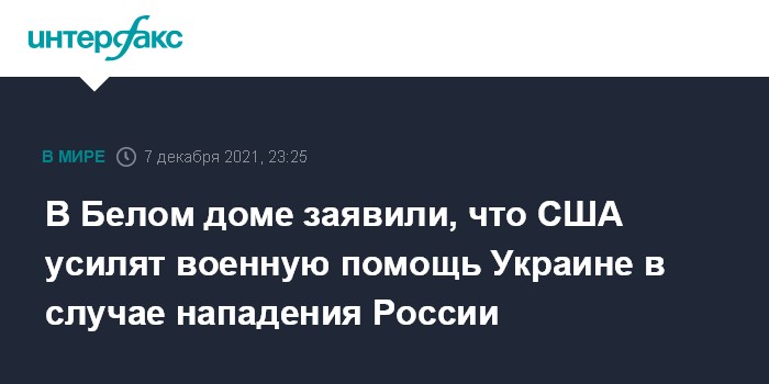 Москва. 7 декабря. INTERFAX.RU - США будут готовы предоставить дополнительную военную помощь Украине, если она подвергнется нападению со стороны России, заявил советник американского президента по нацбезопасности Джейк Салливан.