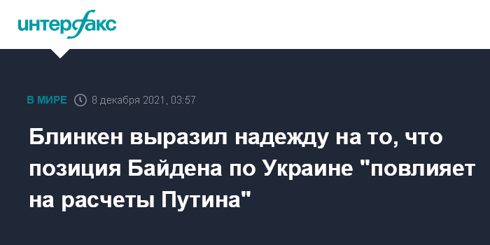 Москва. 8 декабря. INTERFAX.RU - Президент США Джо Байден во время беседы с российским лидером Владимиром Путиным откровенно сообщил об озабоченностях в связи с ситуацией вокруг Украины и последствиях в случае российского вторжения, Вашингтон рассчитывает, что это повлияет на дальнейшие планы России, заявил госсекретарь США Энтони Блинкен.