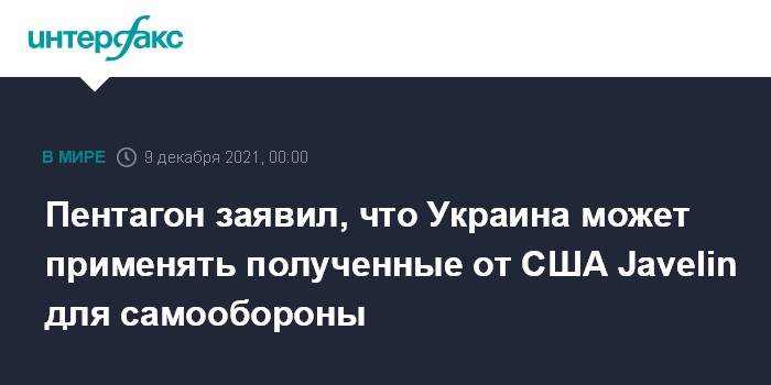 Москва. 8 декабря. INTERFAX.RU - Украинские военные вправе применять полученные от США противотанковые ракетные комплексы Javelin в любой части своей страны, но делать это следует только для самообороны, заявил в среду представитель Пентагона Джон Кирби.