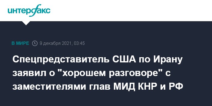"Состоялся хороший разговор с замминистра иностранных дел Рябковым и Ма Чжаосюем. Как мы договорились перед 7-м раундом переговоров, мы продолжим тесную трехстороннюю координацию для достижения нашей общей цели взаимного полного соблюдения СВПД (Совместного всеобъемлющего плана действий - ИФ) на основе прогресса, достигнутого в течение первых шести раундов", - написал дипломат в своем твиттере.