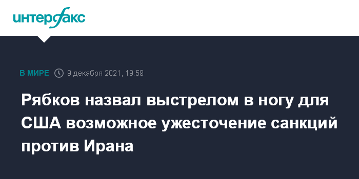 Москва. 9 декабря. INTERFAX.RU - Ужесточение санкций против Ирана станет "выстрелом в ногу" для Вашингтона, отдалит восстановление иранской ядерной сделки, заявил в четверг журналистам замглавы МИД РФ Сергей Рябков.