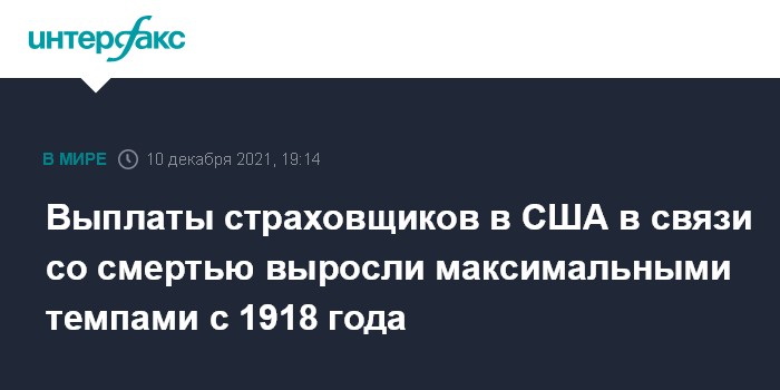 Москва. 10 декабря. INTERFAX.RU - Выплаты американских компаний сферы страхования жизни в связи со смертью застрахованных лиц в 2020 году выросли на 15,4% по сравнению с предыдущим годом - максимальными темпами со времен пандемии "испанского гриппа".