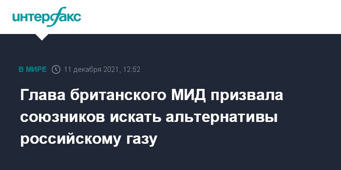Москва. 11 декабря. INTERFAX.RU - Великобритания и ее союзники должны работать над поиском альтернатив поставкам газа из России, заявила в субботу глава британского МИД Лиз Трасс.