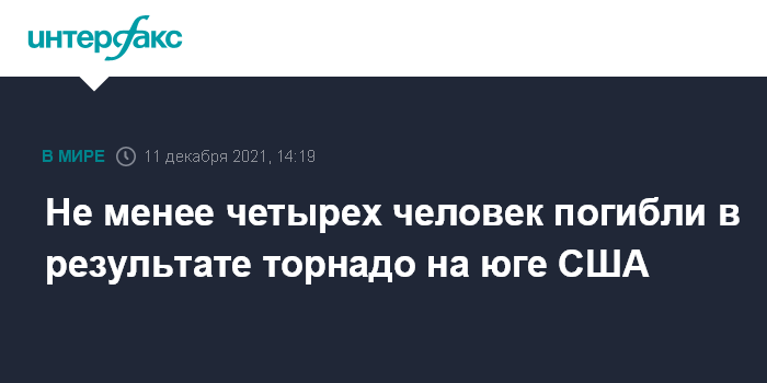 Москва. 11 декабря. INTERFAX.RU - Торнадо обрушились на несколько штатов США. Как сообщает Associаted Press, в Теннесси погибли три человека, еще один человек погиб в доме престарелых в Арканзасе.