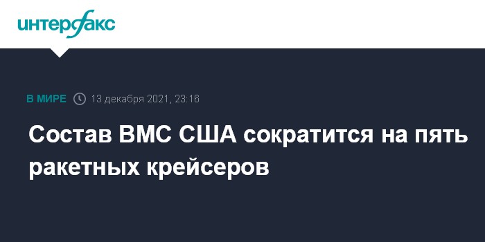 Москва. 13 декабря. INTERFAX.RU - ВМС США выведут из своего боевого состава пять ракетных крейсеров типа Ticonderoga, оснащенных крылатыми ракетами Tomahawk, в рамках оптимизации сил и сокращения расходов на их поддержание, следует из данных решений Конгресса по финансированию флота.