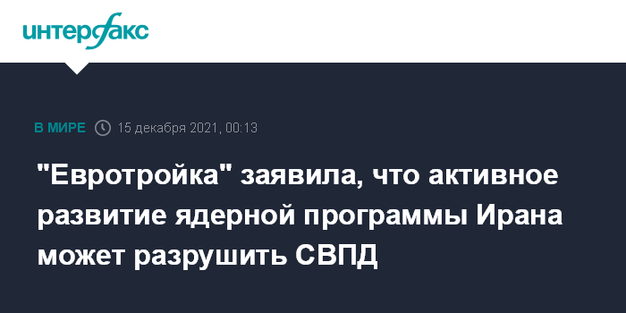 Москва. 15 декабря. INTERFAX.RU - Темпы развития иранской ядерной программы идут вразрез не только с процессом восстановления соглашения по иранскому атому (СВПД), но и наносят урон глобальной системе нераспространения ядерного оружия, говорится в заявлении "Евротройки" - Франции, Германии и Великобритании.