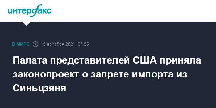 Москва. 15 декабря. INTERFAX.RU - Законопроект, запрещающий ввоз в Соединенные Штаты товаров, произведенных в Синьцзян-Уйгурском автономном районе (СУАР) КНР, был одобрен Палатой представителей американского Конгресса.