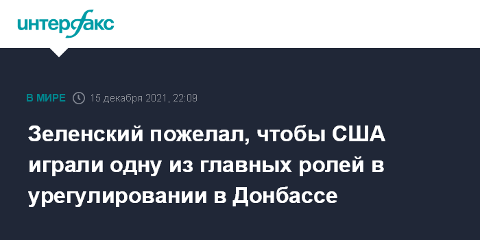 Москва. 15 декабря. INTERFAX.RU - Президент Украины Владимир Зеленский хотел бы, чтобы Соединенные Штаты Америки играли одну из главных ролей в урегулировании конфликта в Донбассе.