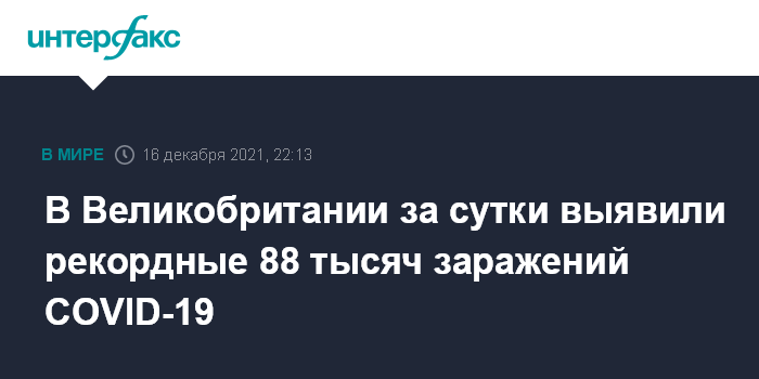 Москва. 16 декабря. INTERFAX.RU - В Великобритании за последние 24 часа выявили более 88 тысяч случаев заражений коронавирусом, что является максимальным с начала пандемии COVID-19 суточным показателем, передает в четверг телеканал Sky News со ссылкой на официальные данные.