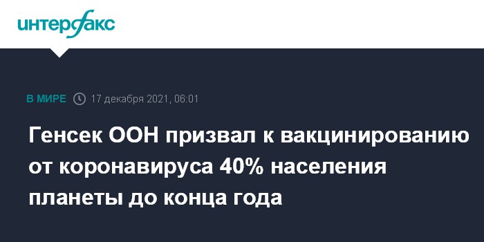 Москва. 17 декабря. INTERFAX.RU - Всем странам мира необходимо приложить максимум усилий для выполнения задачи вакцинации до конца года 40% мирового населения, заявил генсек ООН Антониу Гутерриш.