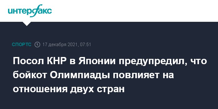 Москва. 17 декабря. INTERFAX.RU - Присоединение Токио к объявленному США дипломатическому бойкоту зимних Олимпийских игр 2022 года в Пекине может нанести ущерб китайско-японским отношениям, заявил посол КНР в Японии Кун Сюанью.