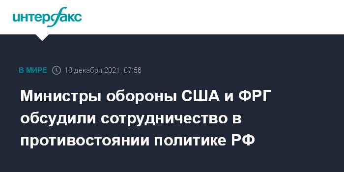 Москва. 18 декабря. INTERFAX.RU - Министры обороны США Ллойд Остин и Германии Кристина Ламбрехт в ходе телефонной беседы обсудили вопросы, касающиеся противодействия политике России в Восточной Европе, сообщил Пентагон.