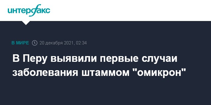 Москва. 20 декабря. INTERFAX.RU - В Перу выявили первые четыре случая заболевания вариантом COVID-19 "омикрон", сообщают местные СМИ со ссылкой на министра здравоохранения Эрнандо Севальоса.