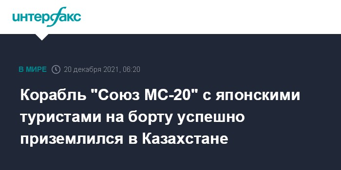 Москва. 20 декабря. INTERFAX.RU - Спускаемый аппарат корабля "Союз МС-20" с японскими космическими туристами Юсаку Маэдзавой и Йозо Хираной, а также российским космонавтом Александром Мисуркиным успешно приземлился в Казахстане, следует из трансляции "Роскосмоса".