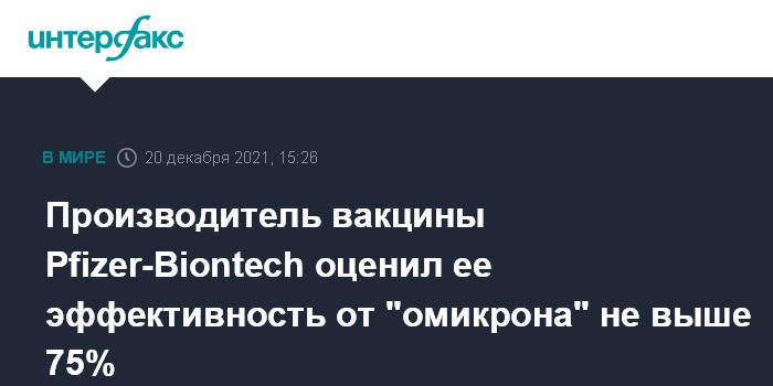 Москва. 20 декабря. INTERFAX.RU - Вакцина от коронавируса производства Pfizer-Biontech против "омикрона" показывает эффективность в примерно 70% после трех доз и от 20% до 40% после двух доз, заявил Le Monde гендиректор BioNTech Угур Шахин.