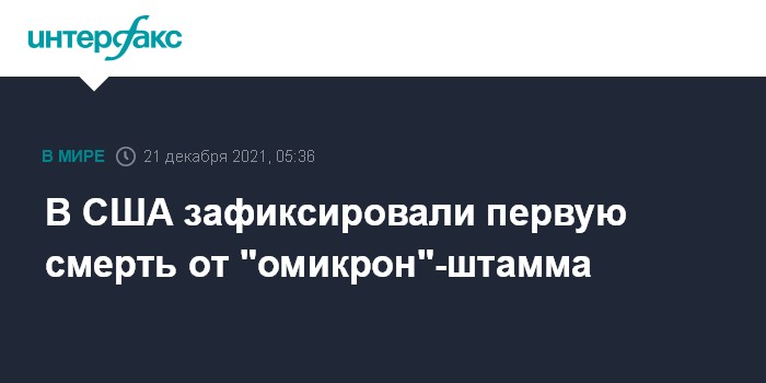 Москва. 21 декабря. INTERFAX.RU - В Соединенных Штатах зафиксировали первую смерть от заражения штаммом "Омикрон". Об этом во вторник, 21 декабря, со ссылкой на органы здравоохранения штата Техас передает телеканал ABC.
