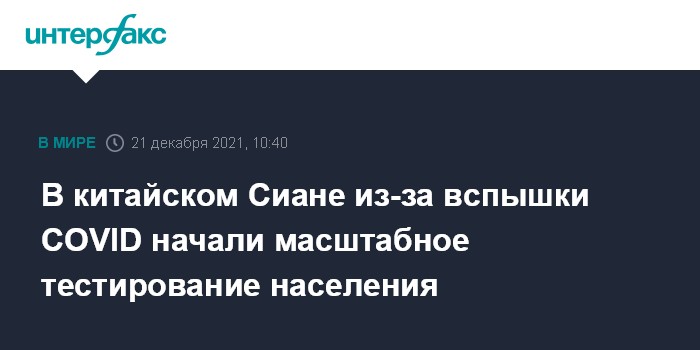 Москва. 21 декабря. INTERFAX.RU - Власти китайского города Сиань (провинция Шэньси) во вторник начали тестировать на коронавирус миллионы его жителей в связи с угрозой более масштабного распространения COVID-19 в преддверии сезона праздничных поездок, передают западные СМИ.