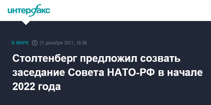 Москва. 21 декабря. INTERFAX.RU - Генсек НАТО Йенс Столтенберг сообщил о планах организовать в начале 2022 года заседание Совета НАТО-Россия для урегулирования разногласий между альянсом и Москвой.