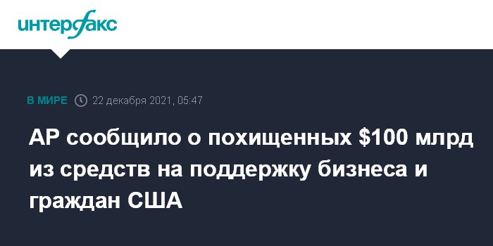 Москва. 22 декабря. INTERFAX.RU - Не менее $100 млрд было похищено в США из средств, выделенных из бюджета на реализацию программ помощи предприятиям и людям, потерявшим работу из-за пандемии, сообщило агентство Associated Press со ссылкой на данные Секретной службы США.