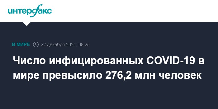 Москва. 22 декабря. INTERFAX.RU - Число зарегистрированных случаев заражения коронавирусом COVID-19 в мире на утро среды выросло до 276 243 089, свидетельствуют данные американского университета Джонса Хопкинса.